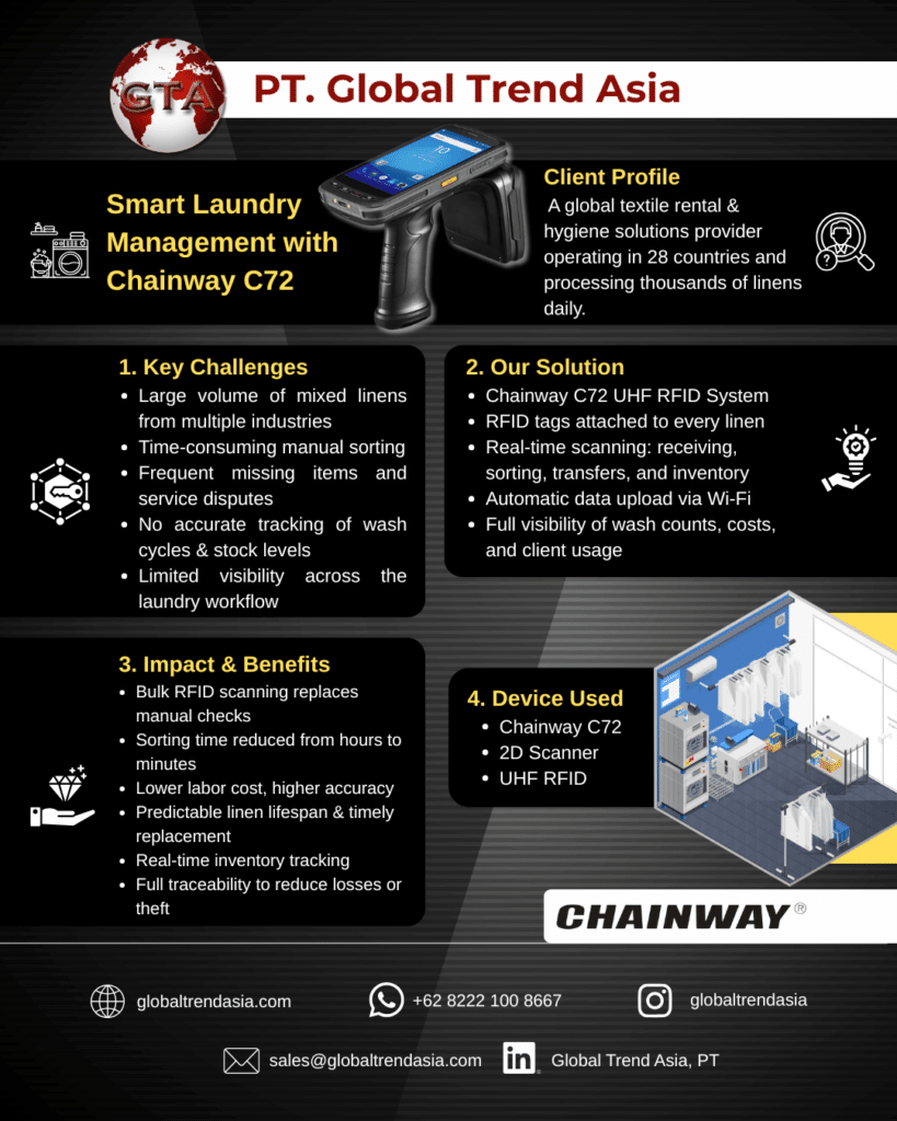 All process data is collected automatically and transmitted in real time to the backend system via Wi-Fi. This allows managers to monitor wash counts, washing costs, rental quantities, and customer-specific usage. Equipped with a self-developed RFID module, the Chainway C72 delivers full visibility of the laundry lifecycle and supports data-driven decision-making.